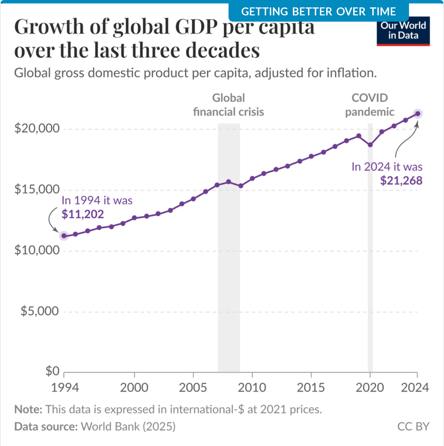 Global GDP Per Capita Grows Steadily Despite Turbulence It rarely makes headlines, but global economic well-being has grown steadily for three decades. New data shows that GDP per capita â a key measure of average economic prosperity â has increased almost every year since the 1990s, even through periods of crisis. The consistency is striking. While individual countries face setbacks, the overall trajectory is one of resilience and growth, especially in developing nations. This long-term view suggests that progress is often quiet, gradual, and cumulative â the opposite of what most news cycles reflect.